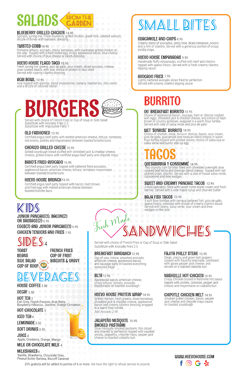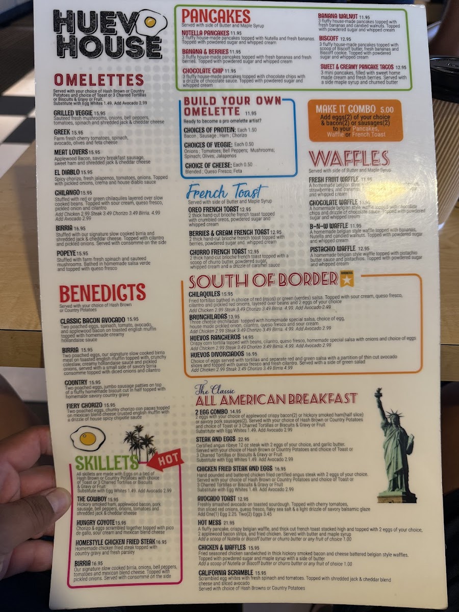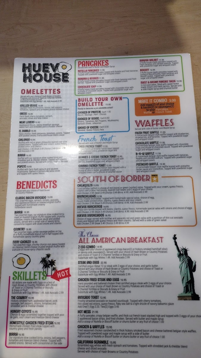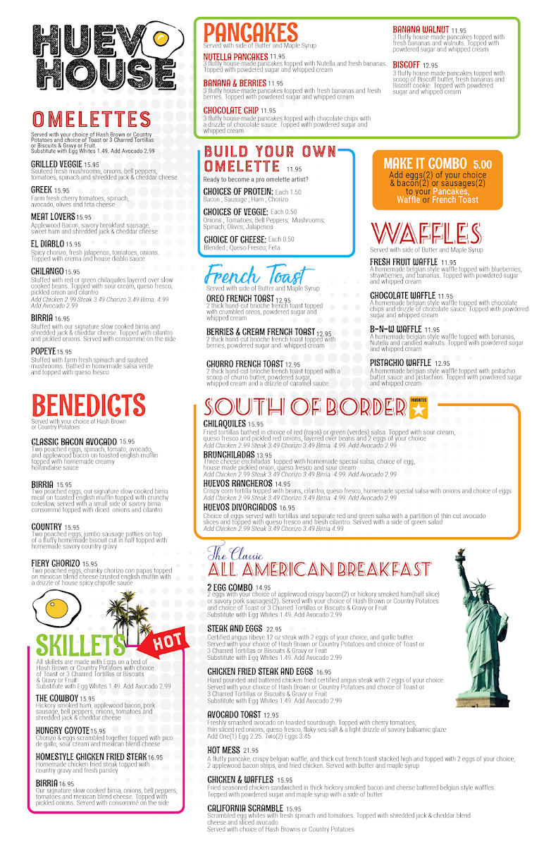 Welcome to Huevo House, a vibrant culinary haven nestled in the heart of Bakersfield, CA. Known for its diverse menu, this restaurant promises an exciting brunch experience that delights the senses. Their signature Benedicts, including the Fiery Chorizo Benedict and Birria Benedict, are standout choices, each bursting with flavor at just $17.54. For sandwich lovers, the Fajita Philly Steak Sandwich and Nashville Chicken Sandwich are must-tries, showcasing bold combinations for $16.44 each.